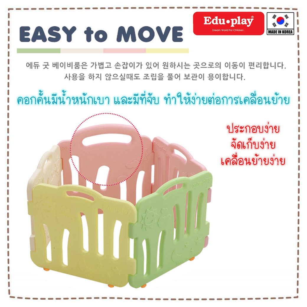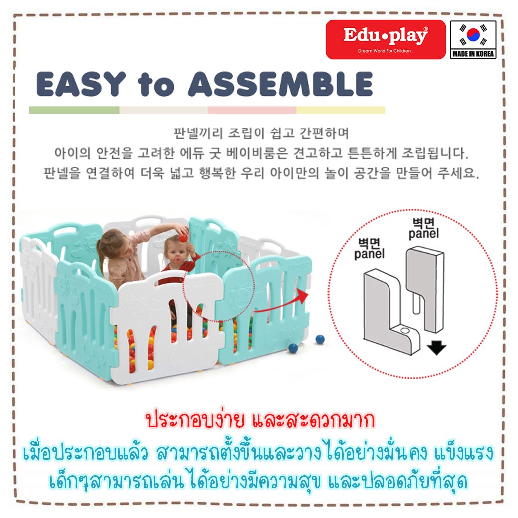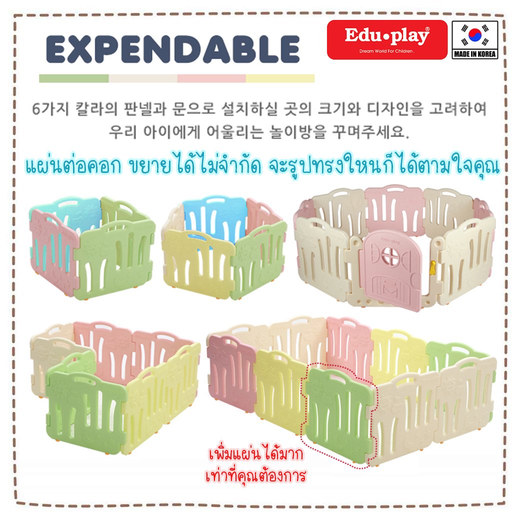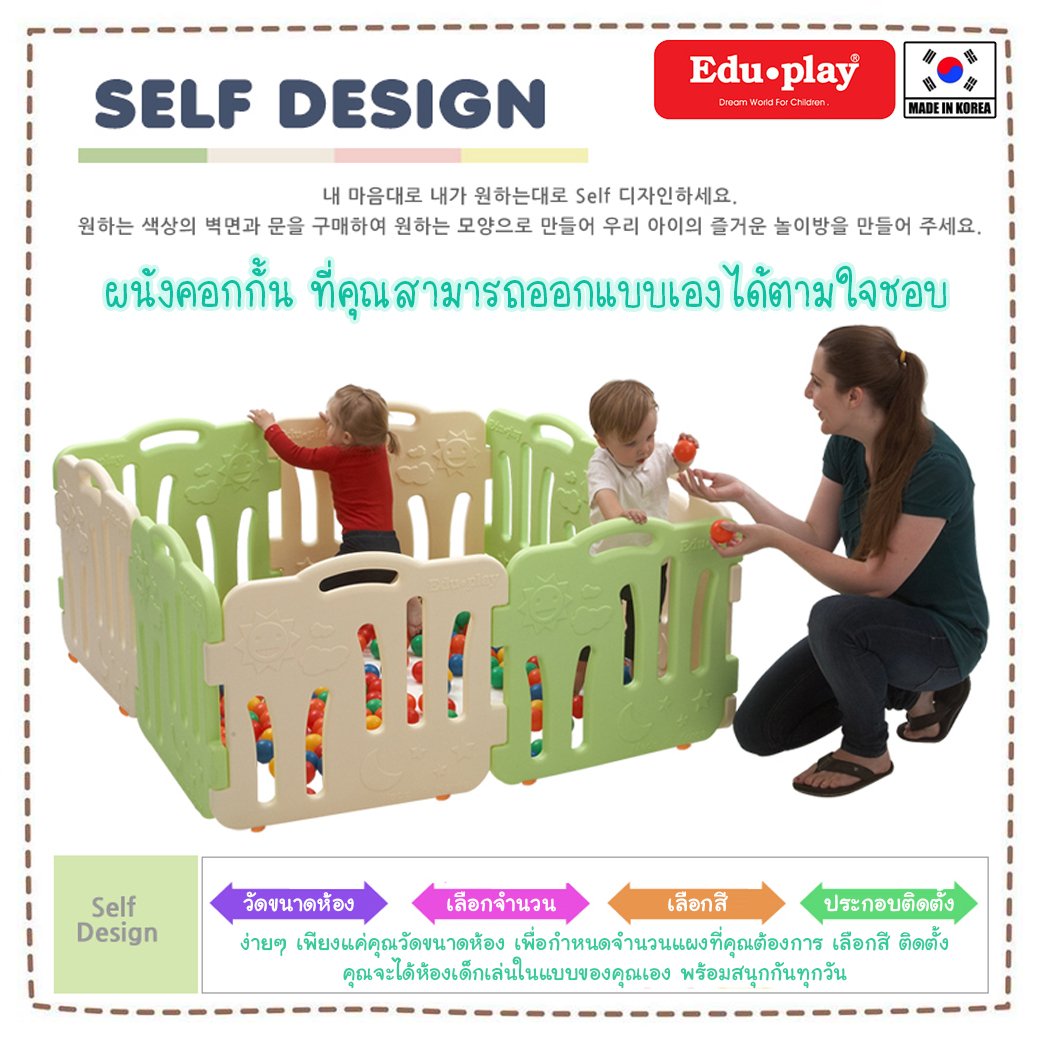 แบรนด์ Eduplay ยักษ์ใหญ่แห่งวงการของเล่นประเทศเกาหลี แนะนำคอกกั้นเด็กเกาหลี Edu Play ได้พัฒนาคอกกั้นเด็กเกาหลี ให้มีความปลอดภัยสูง มีรูปลักษณ์ภายนอกที่สวย มีฟังก์ชั่นต่อเพิ่มขยายได้