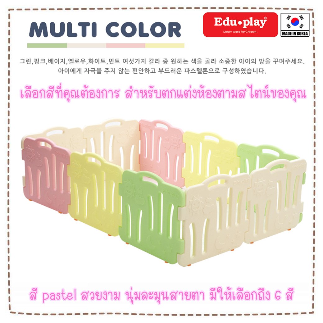ในเรื่องของสีนั้น เป็นสีที่ปลอดภัยกับเด็กทุกวัย ไม่หลุดลอก 100% ทำให้หมดห่วงเรื่องการใช้งานโดยคอกกั้นเด็ก Edu Play นั้น เป็นที่นิยมมากทั้งในประเทศเกาหลี และประเทศไทยค่ะ