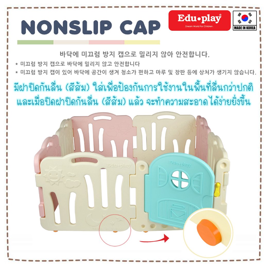 คอกกั้นเด็กเกาหลี แบรนด์ Eduplay จะทำให้เจ้าตัวเล็กได้มีพื้นที่ส่วนตัว และสนุกมากยิ่งขึ้น มีการพัฒนาที่ไม่หยุดยั้งอยู่ตลอดเวลา ไม่ว่าจะเป็นการพัฒนาวัสดุการผลิตของพลาสติกที่เหนียว ทนทาน ปลอดสารพิษ ไม่แตกหักง่าย ลบเหลี่ยมมุม ซึ่งออกแบบมาให้ไม่มีเหลี่ยมเชื่อมต่อโดยไม่ใช่สกรู หรือน็อตแม่แต่ชิ้นเดียว เพื่อความปลอดภัยสูงสุด