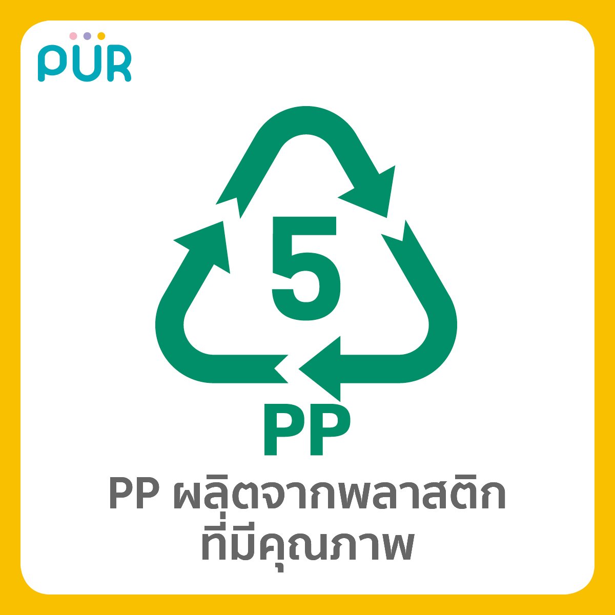 PP มีเลข 5 ตรงกลางและมีรูปลูกศรล้อมรอบ หมายถึงขวดนมนี้ได้มาตรฐานผลิตจาก Polypropylene หรือ PP ซึ่งเป็นพลาสติกที่ปลอดภัยไม่มีสารพิษ