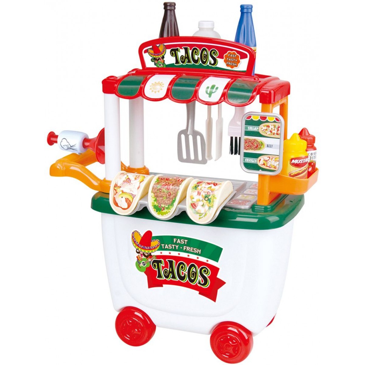 ร้านรถเข็นขายขนมปังทาโก้ สนุกกับบทบาทสมมุิติที่ได้รับกับการสวมบทบาทเป็นเจ้าของร้านรถเข็นขายขนมปังทาโก้ ออกเดินทางเพื่อขายขนมปังทาโก้ และพบเจอลูกค้ามากมาย ของเล่นเสริมพัฒนาการและทักษะการเรียนรู้ของเด็กๆ