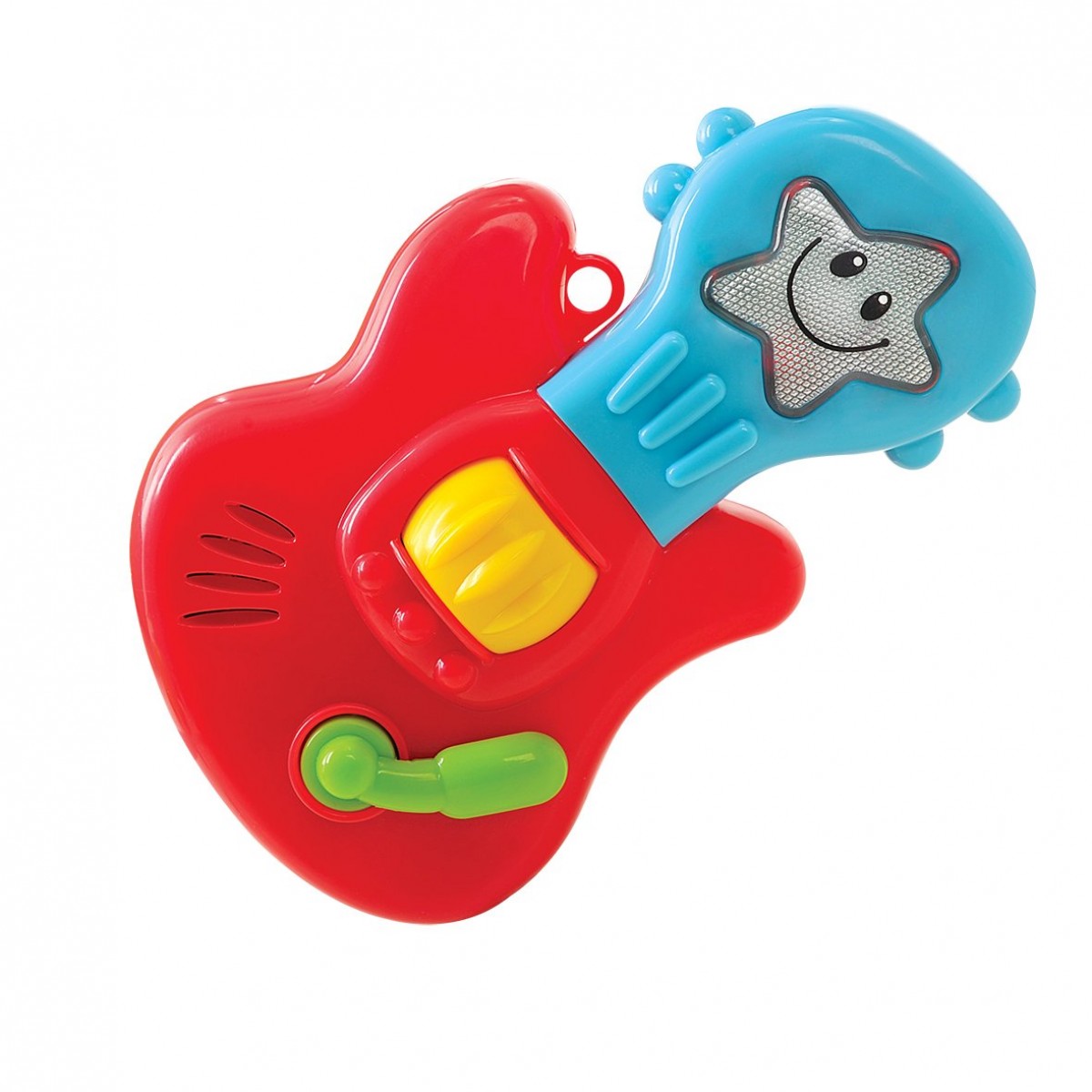 มBaby Rock Star-Guitar กีต้าร์น้องน้อย เป็นของเล่นที่มีขนาดพอเหมาะกับตัวและนิ้วมือเด็ก เมื่อเด็กกดปุ่มจะมีเสียงเพลงและมีไฟแสดงตรงรูปดาว